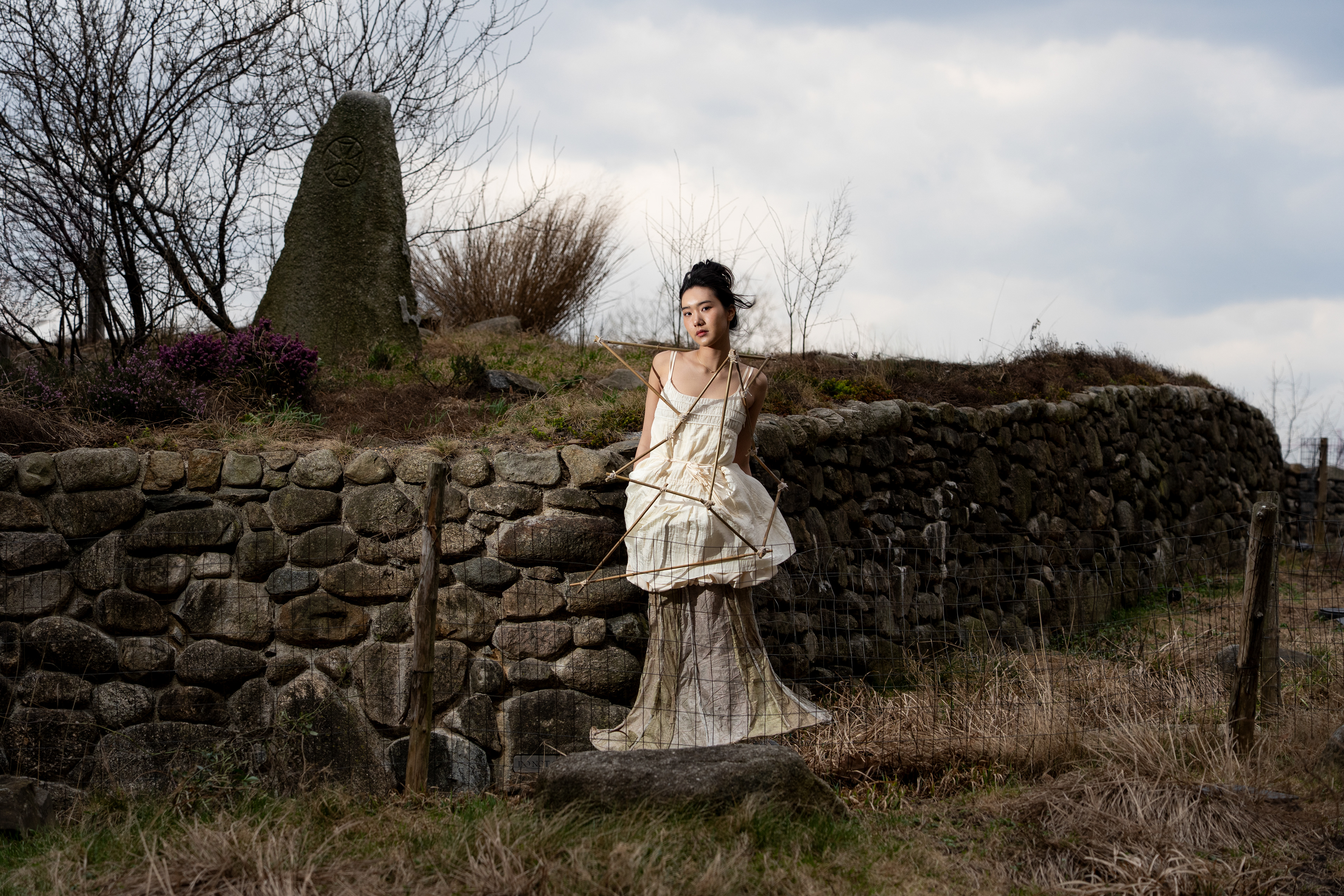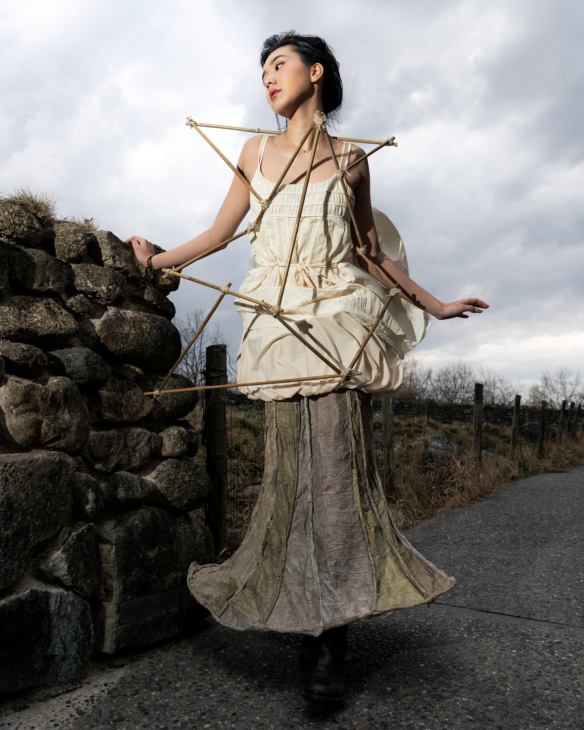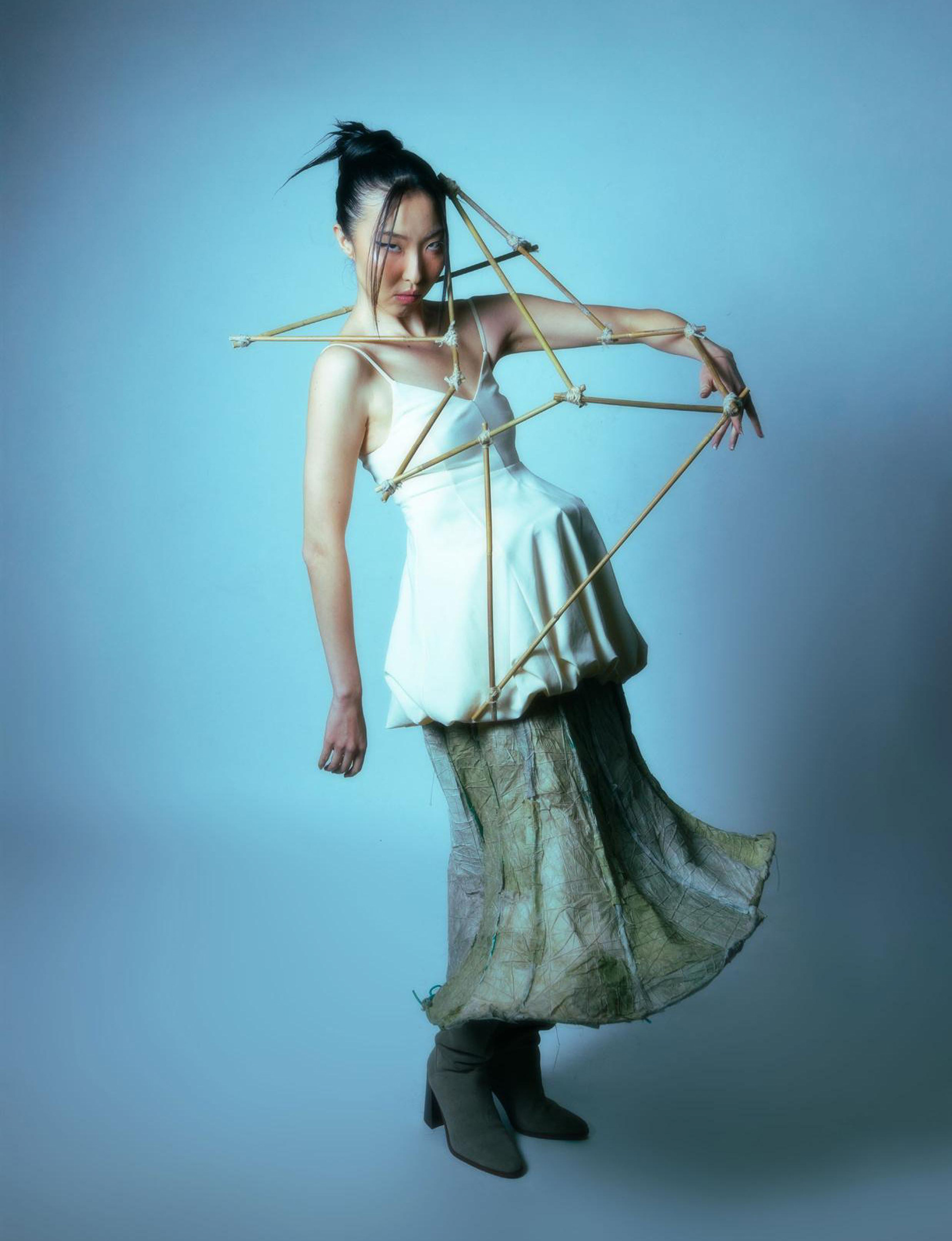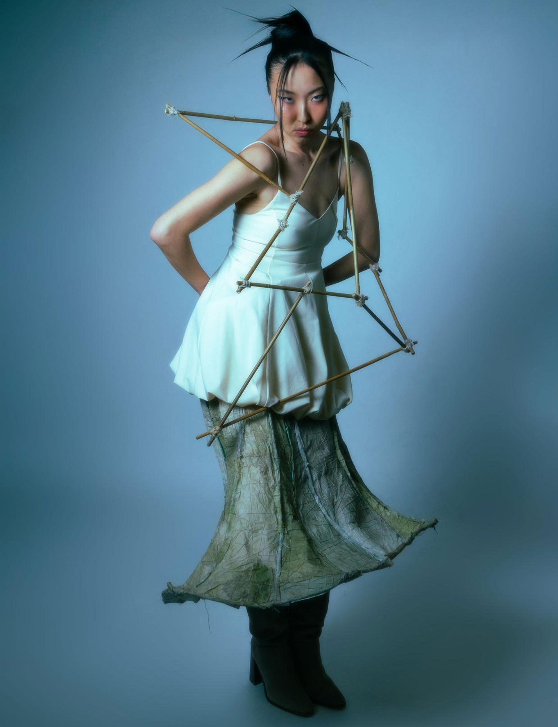 This garment pays homage to his legacy. The skirt inspired by roof structures is fragile, soft, and in need of repair. It’s surrounded by bamboo scaffolding – a traditional support system used to support decaying temples – a decades-old practice that I witnessed being continually utilized in China today.